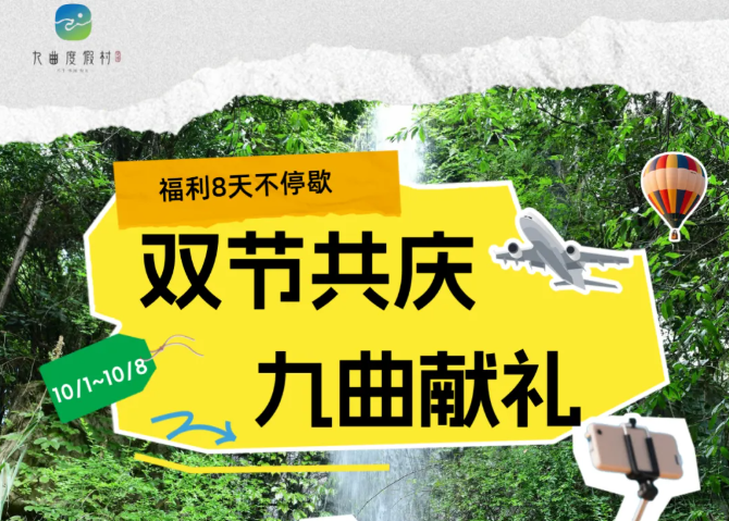 二、门票抵消费 一、特惠游九曲 购票入园赠送贴纸 关注抖音、公众号 加赠小红旗 免费游九曲 国庆期间,售票窗口设有打卡点,6岁以下小朋友现场唱一首与国庆相关的歌曲,赠送大门票一张!可立马使用哦~ 集章送优惠券 集齐度假村内3枚印章送10元代金券 可用于景区内项目抵扣哦~ 二、门票抵消费